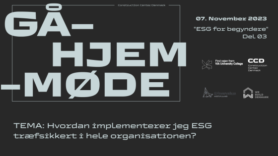 Har tager vi fat i de mest basale ting i løbet af 3 x ’GÅ-HJEM-MØDER’ i Construction Center Denmark. Din rolle kan være ejerleder, direktør, projektchef, byggeleder, projektleder, rådgiver, bæredygtighedsansvarlig, entrepriseleder, eller lignende. Det vigtigste er at du er indstillet på at arbejde med konsekvenserne af ESG i tre intense fyraftensmøder med kompetente folk på scenen og lokale praksiseksempler fra byggeindustrien.